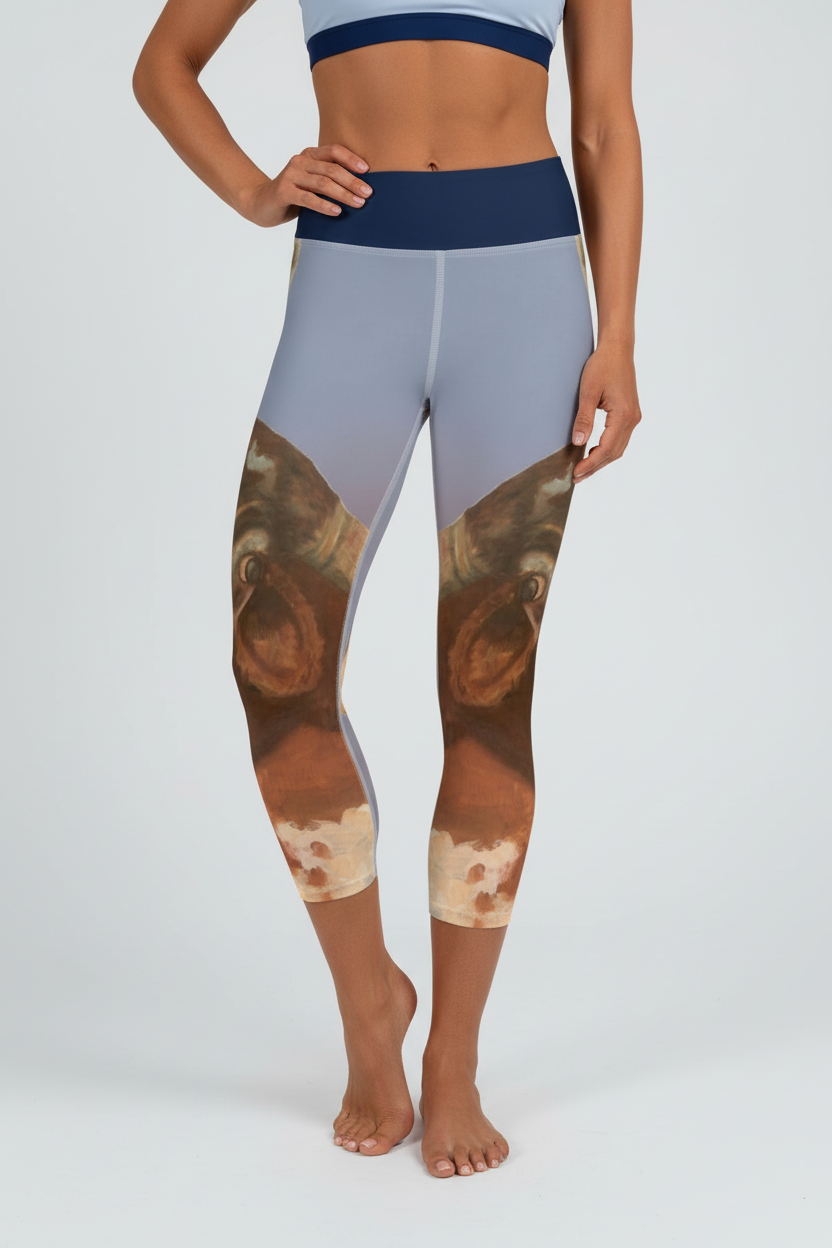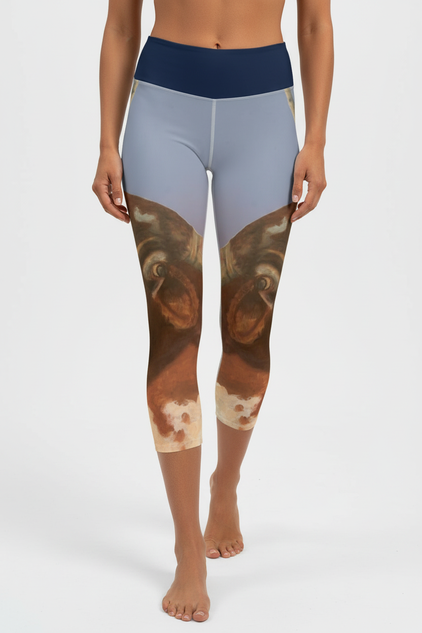 Blue Longhorn steer print capri leggings with high waist. Soft, stretchy 4-way stretch fabric perfect for yoga, gym & everyday wear.