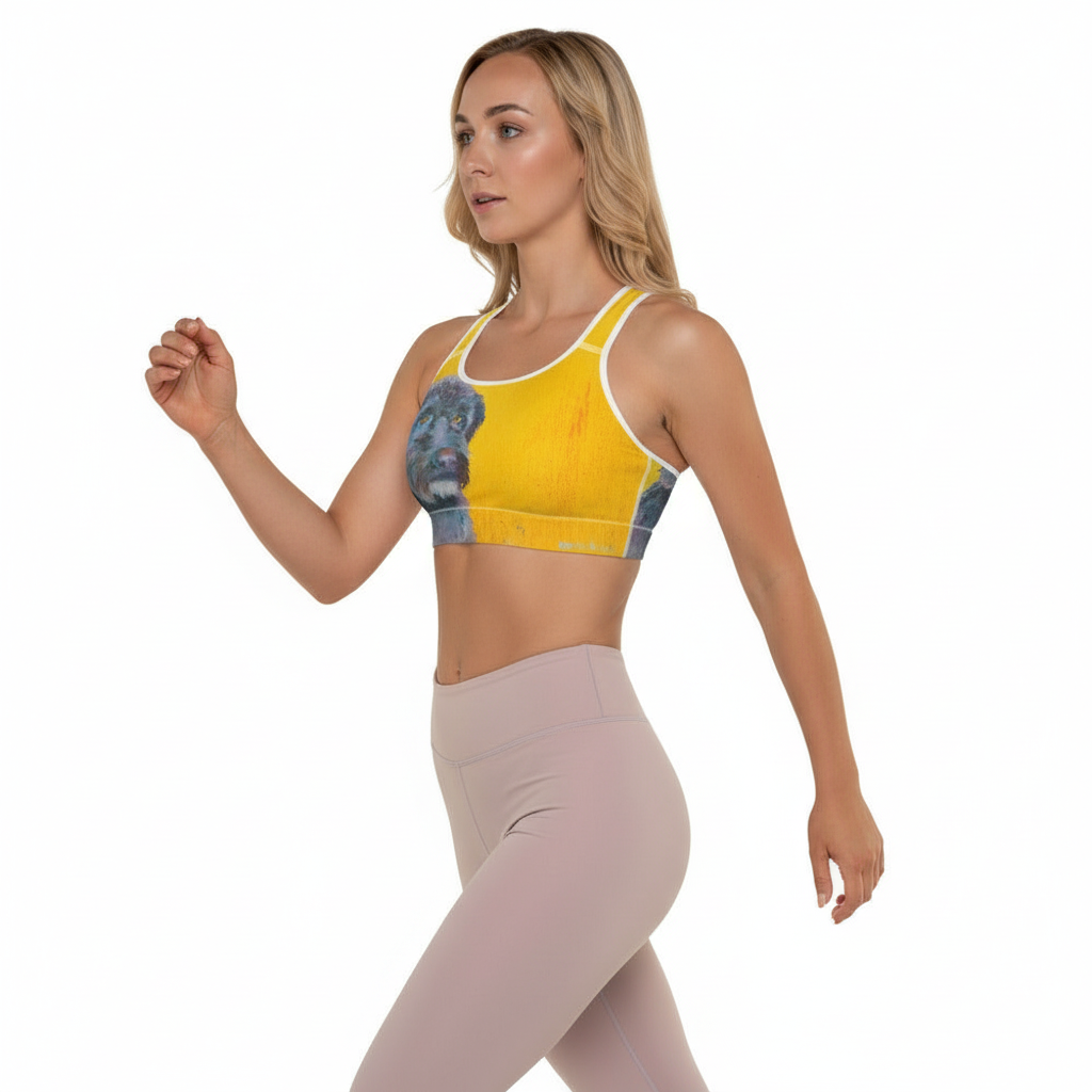 Bright yellow doodle dog print racerback sports bra. Moisture-wicking fabric perfect for yoga, gym & running.