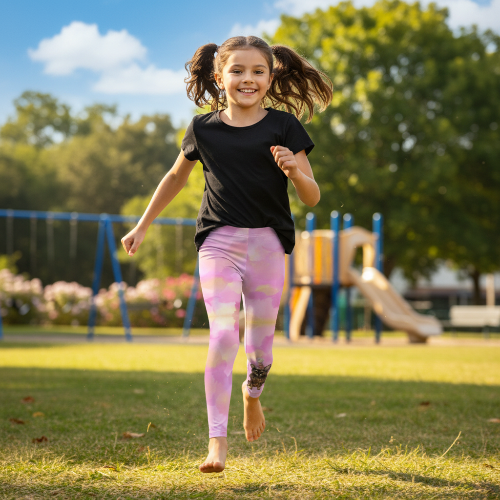 Whimsical party dog print girls leggings. Soft, stretchy fabric perfect for active kids.