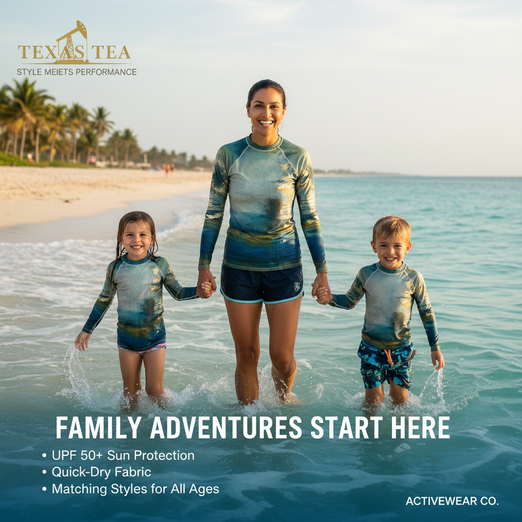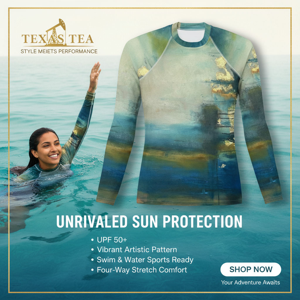 Deep, rich, and undeniably bold! The "Texas Tea" rash guard features a sophisticated abstract print of midnight and ocean blues, struck through with shimmering pops of gold. As a core piece of the Whimsy Fit collection, this top represents where art meets activewear—offering matching mother-daughter designs so you and your "mini-me" can make a high-fashion statement on the water.