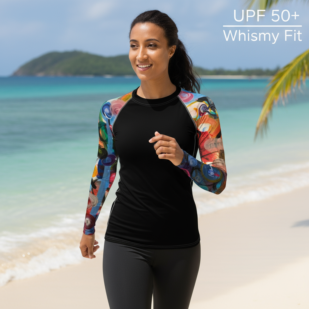 Blue Rash Guard with Colorful, bright, abstract print on sleeves. This smooth and versatile long-sleeve rash guard protects you from the sun, wind, and other elements while doing sports you love to do. It’s slim fit, flat ergonomic seams, and the longer body gives extra comfort and the simming, flattering look you want.