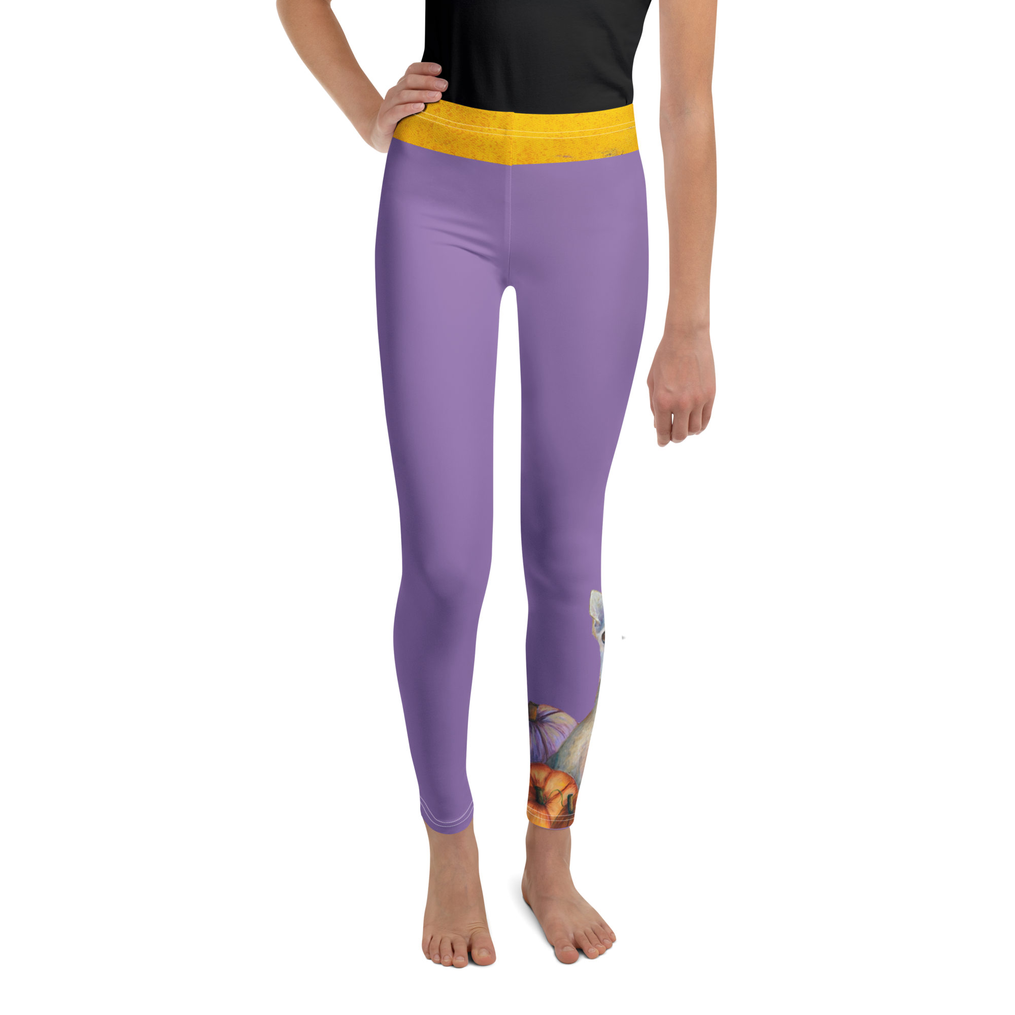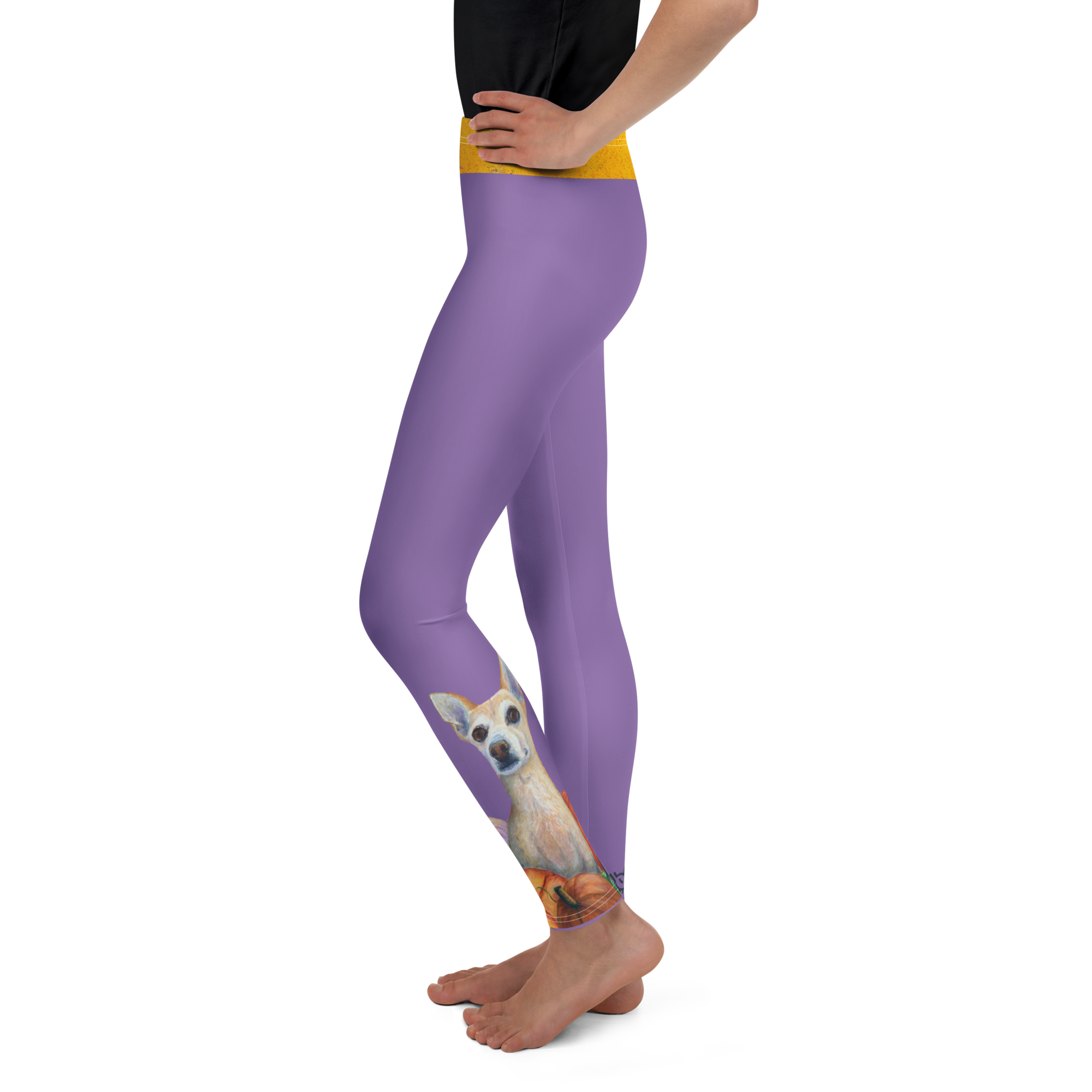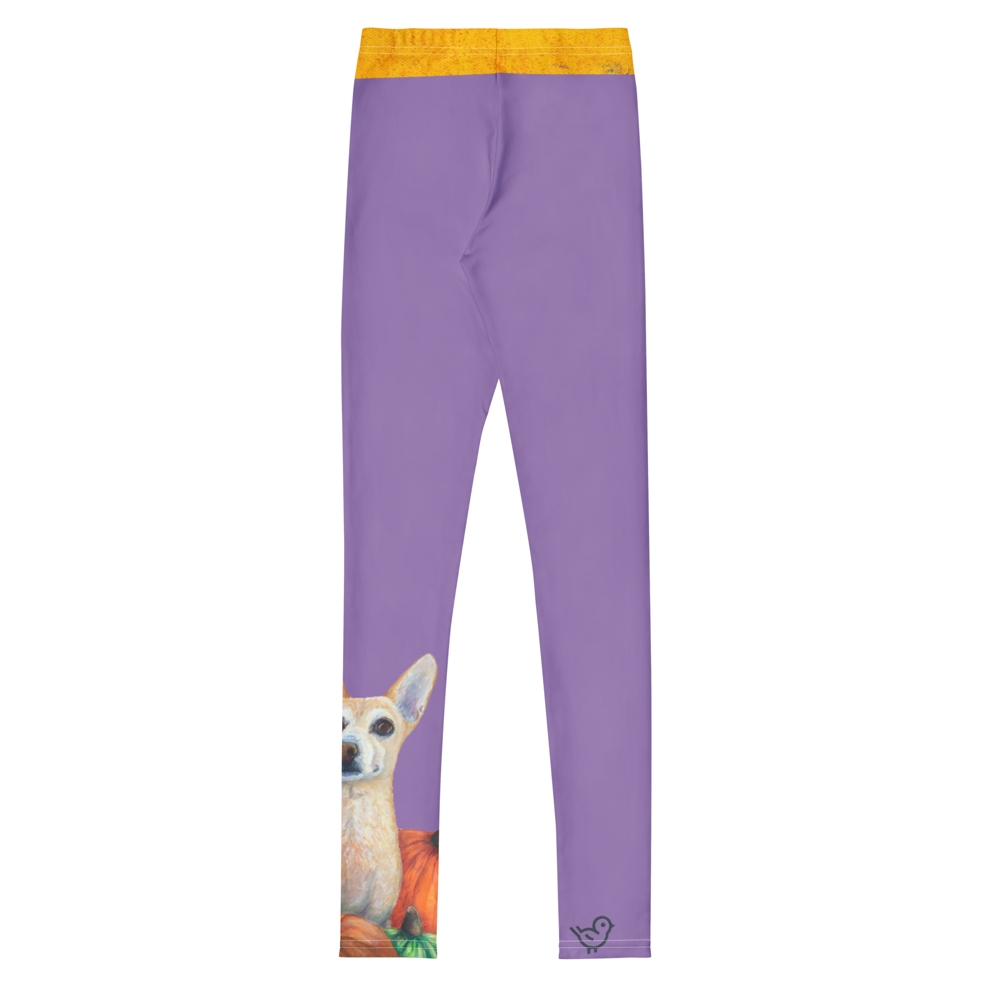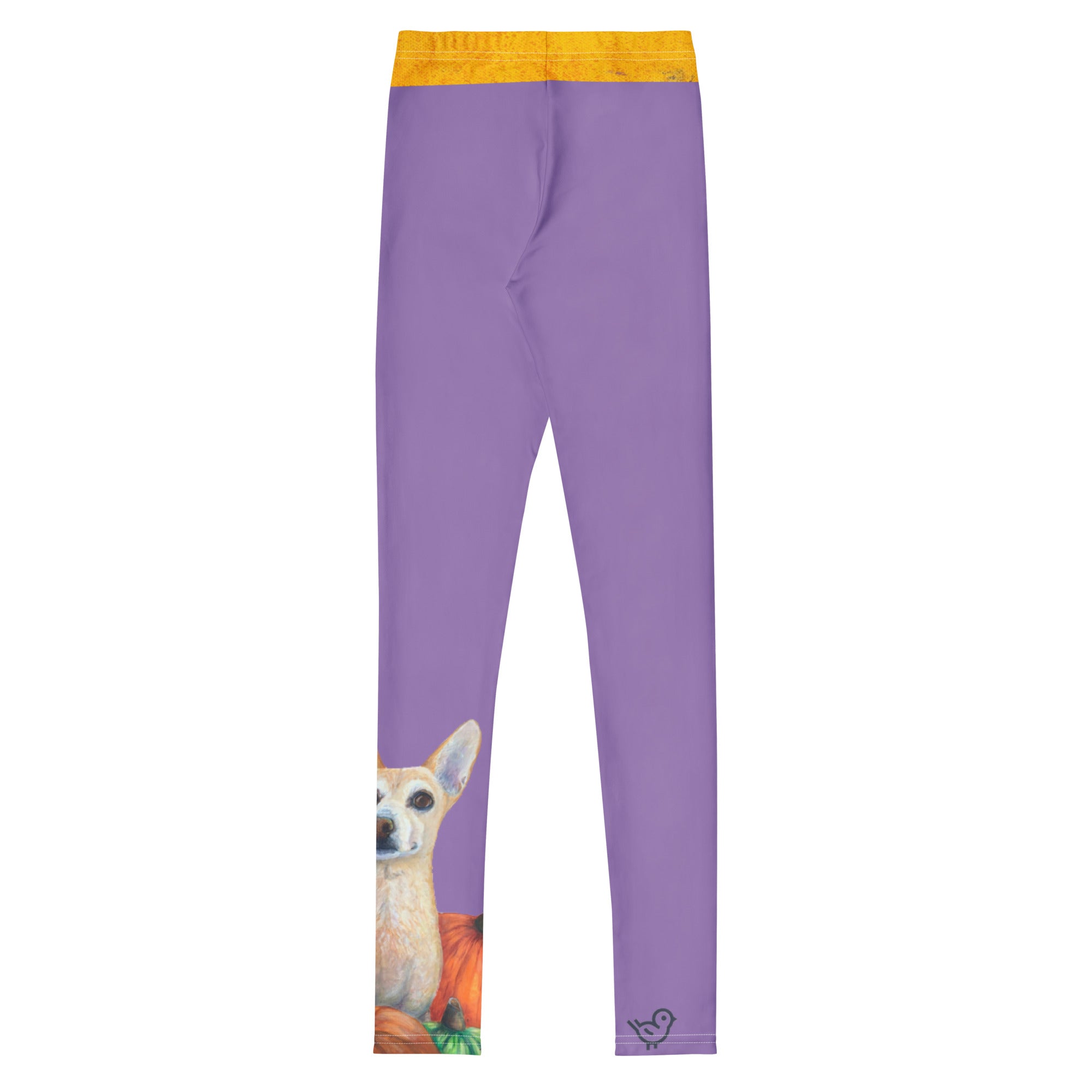 Brighten up her wardrobe with the "Pumpkin Pup" Lavender Chihuahua Girls Leggings. This adorable design features a charming Chihuahua sitting among autumn pumpkins, set against a vibrant lavender background. It’s the ultimate "wearable art" for young dog lovers who want to stay comfortable while looking cute.