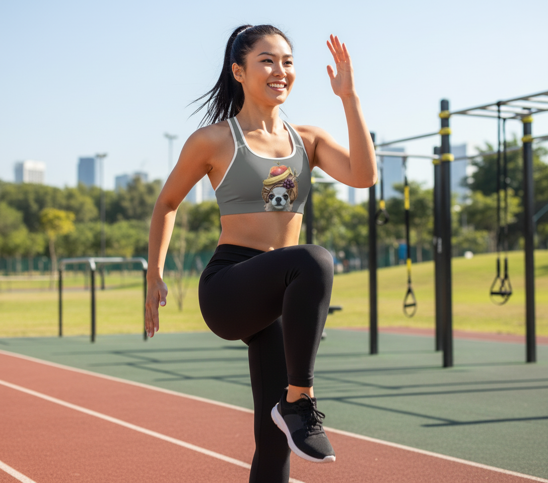 Grey Pomeranian & French Bulldog print racerback sports bra. Moisture-wicking fabric with removable pads for yoga, gym & running.