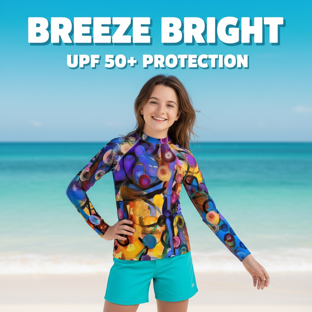 Vibrant Breeze Bright print rash guard with UPF 50+ sun protection and 4-way stretch fabric for swimming and surfing.